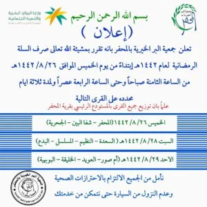 قامت جمعية البر الخيرية بالمحفر بصرف السلة الرمضانية على كافة المستفيدين المقيدين في كشوفات الجمعية .
